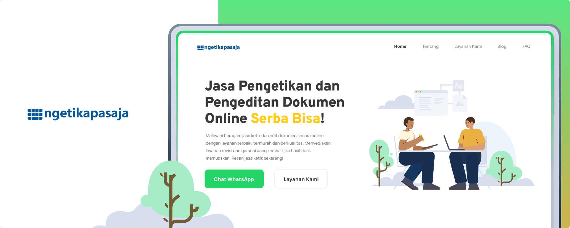 Home / Landing — Introduces Ngetikapasaja with sections like hero, reasons to choose us, service highlights, achievements, mini-FAQ, testimonials, and footer.